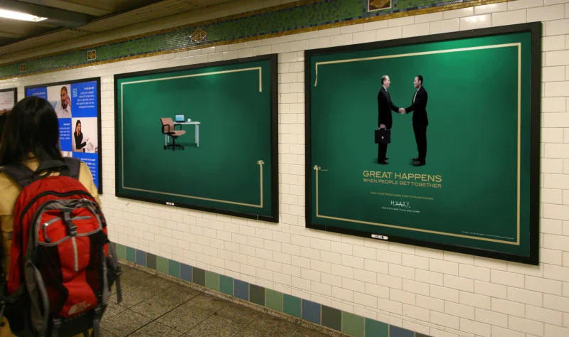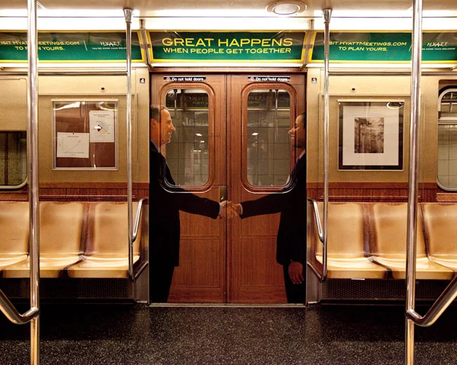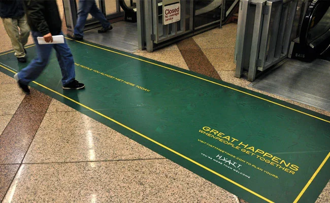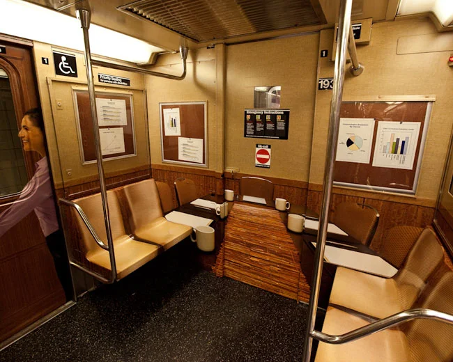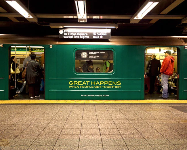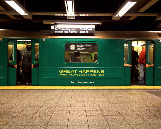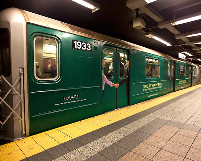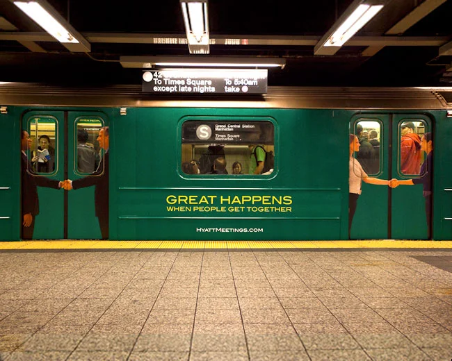 The S train running from Times Square to Grand Central Stations in New York was wrapped on the inside to look exactly like a Hyatt conference room. From the inside and outside of the train you see 2 people shaking hands each time the doors closed.