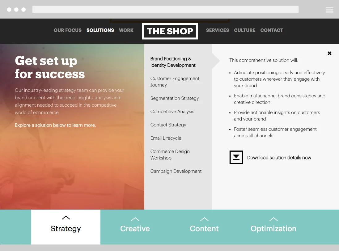 The Shop: the world’s first and only Commerce Design Agency, where the world’s leading brands buy our unparalleled commerce marketing expertise.